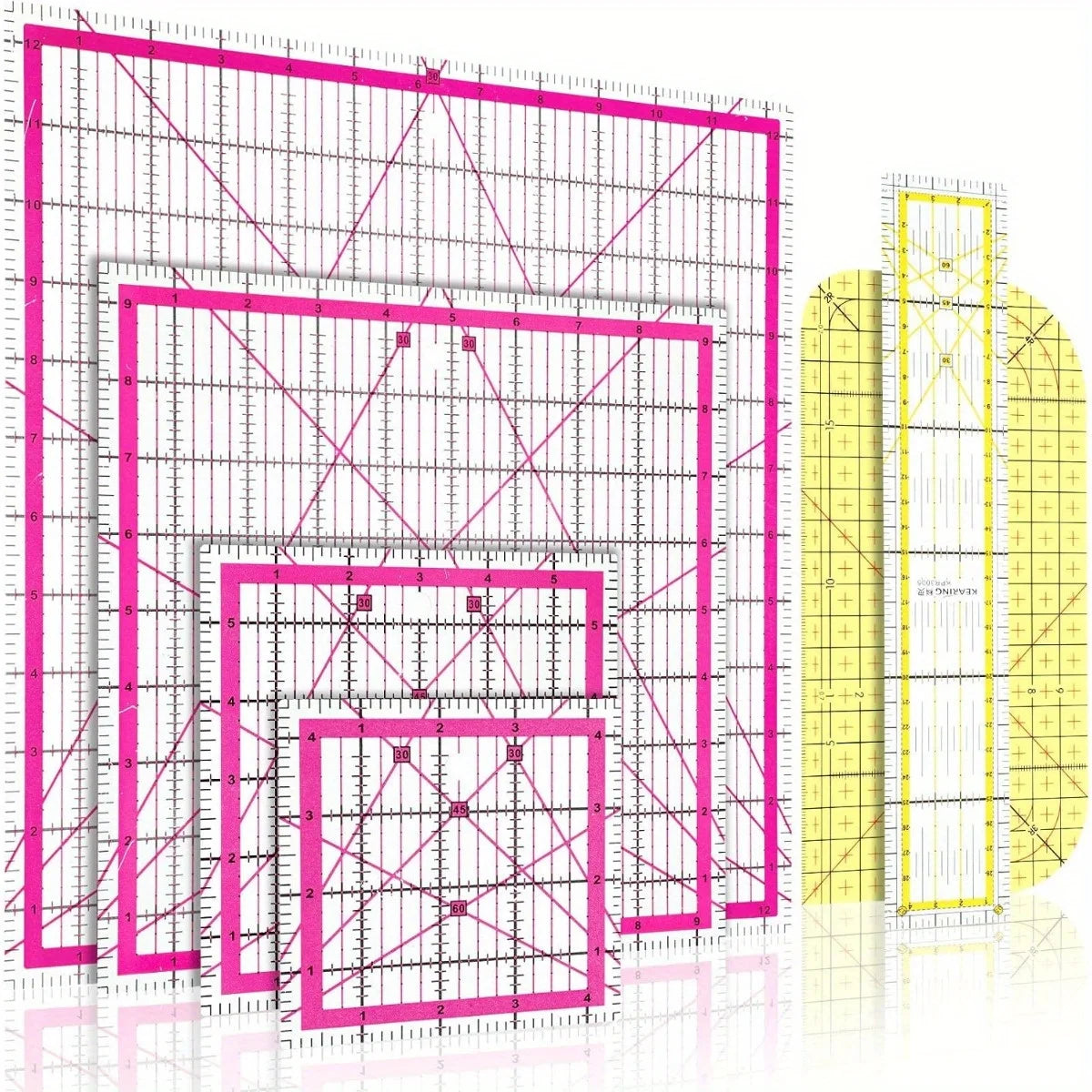 - You get four square quilting rulers in sizes 4.5x4.5, 6x6, 9.5x9.5, and 12.5x12.5 inches, plus one clear acrylic ruler and one ironing ruler for a full alignment toolkit.